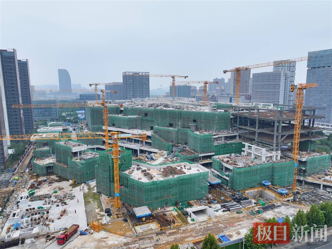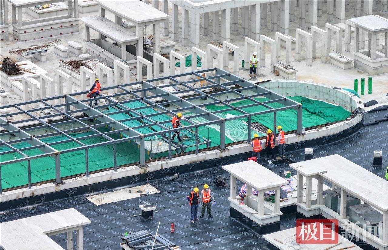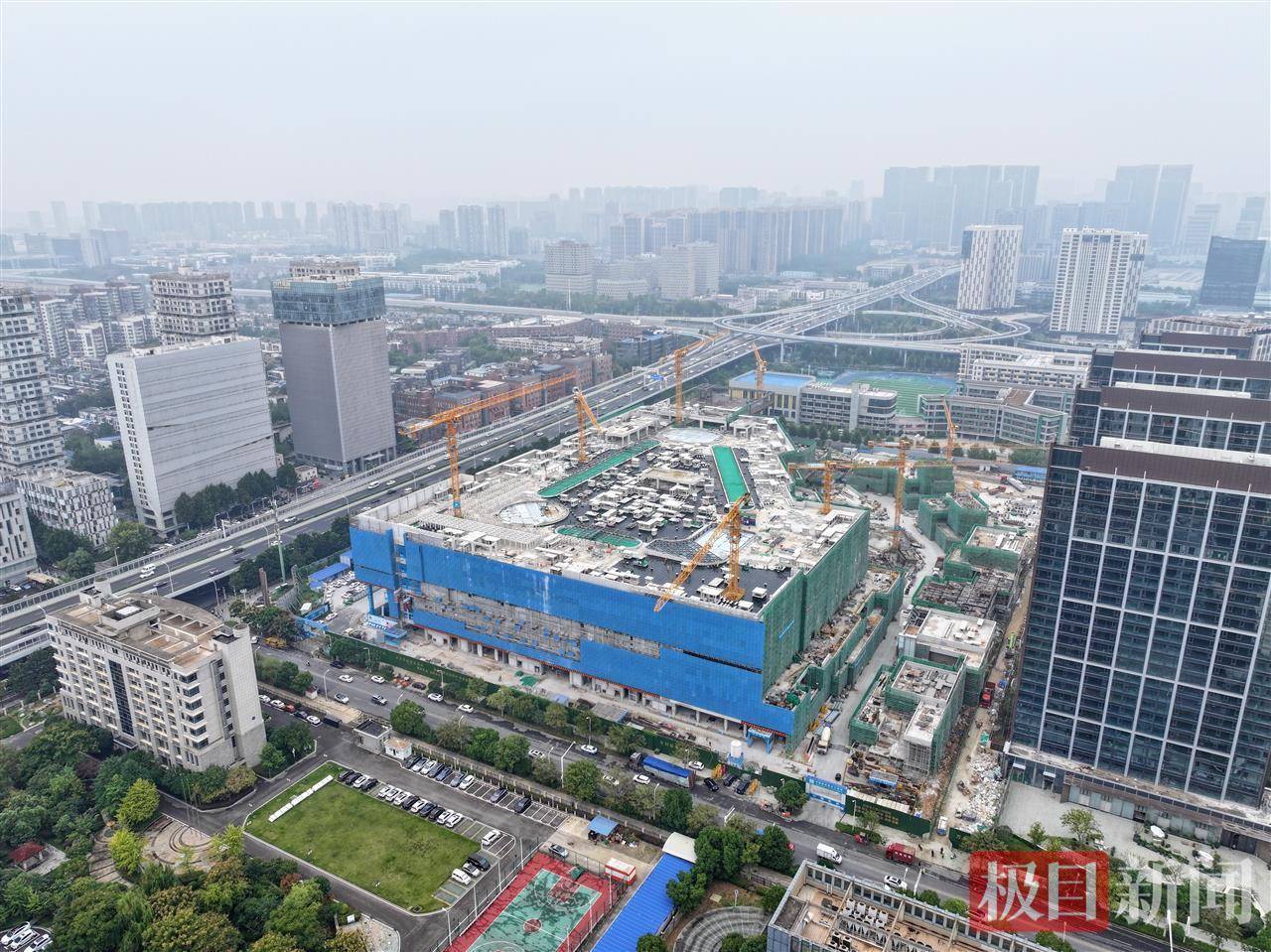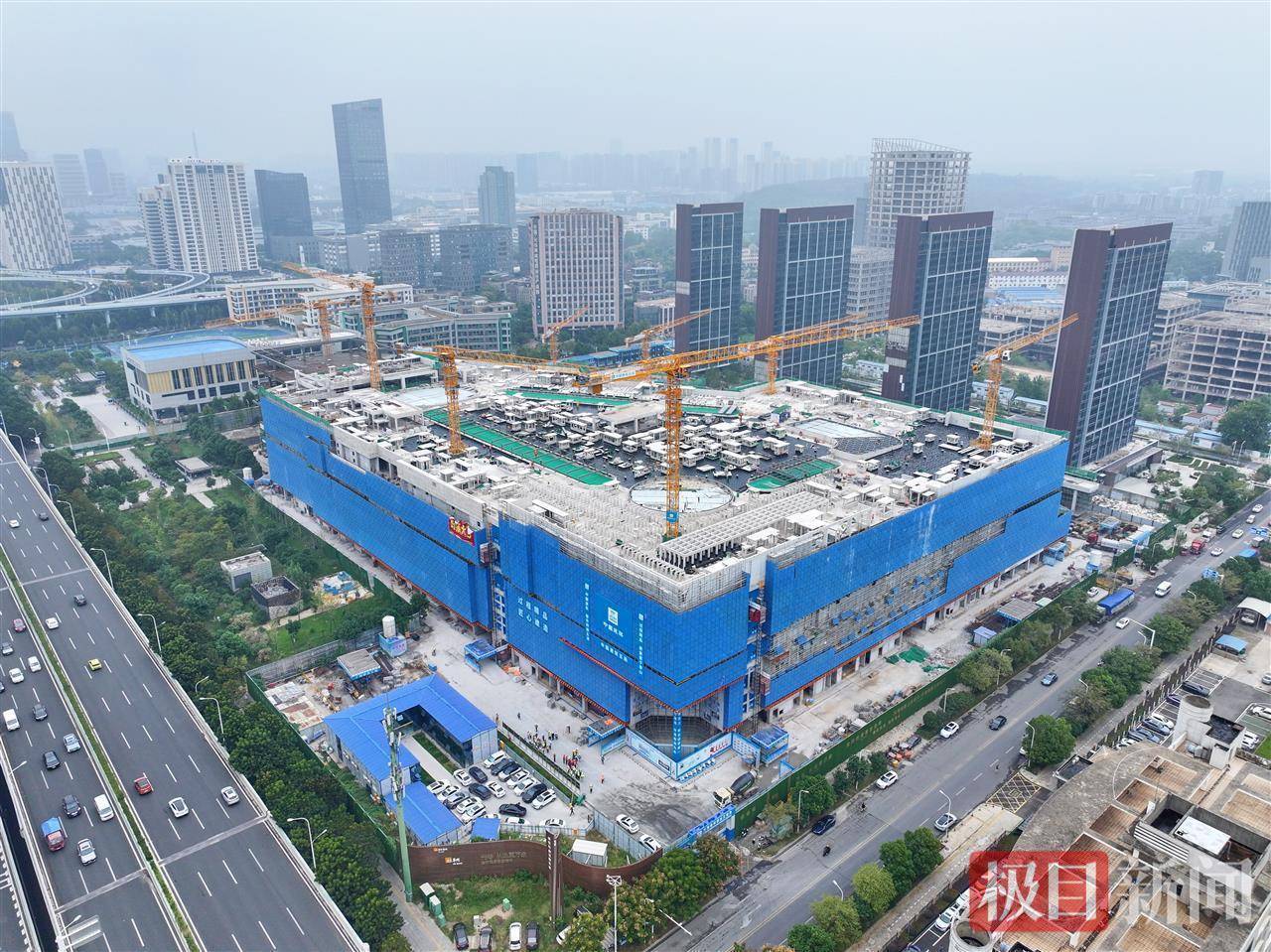 10月15日,俯瞰位于武汉光谷大道与三环线交会处的日前光谷万象天地项目。该项目于日前正式封顶,进入内部精装土建施工阶段,预计2026年下半年开业。武汉光谷万象天地采用“MALL+街区+公园”一体化设计理念,聚焦年轻客群,将引入大量华中首店,同时提供近千个就业岗位。