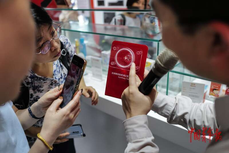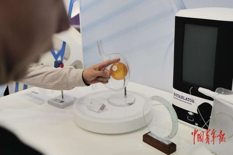 9月24日,海南博鳌乐城国际医疗旅游先行区,媒体记者在参观胃内球囊器械。中青报·中青网记者 赵迪/摄