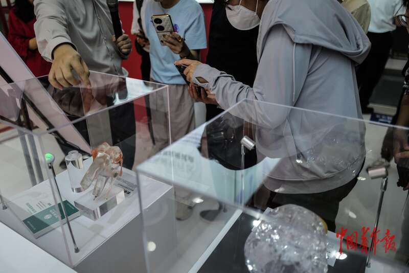 9月24日,海南博鳌乐城国际医疗旅游先行区,媒体记者在拍摄新型软骨修复材料。中青报·中青网记者 赵迪/摄